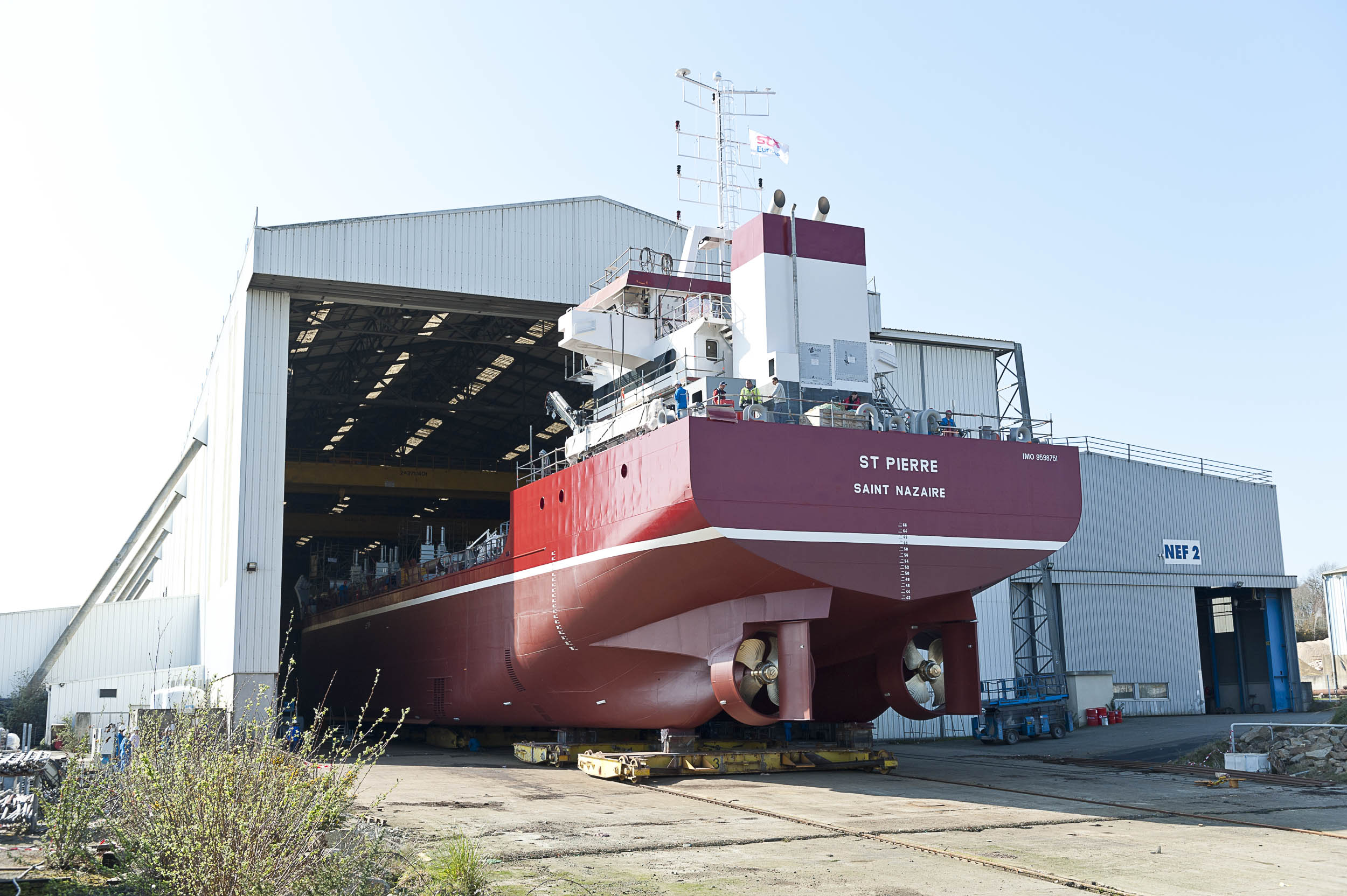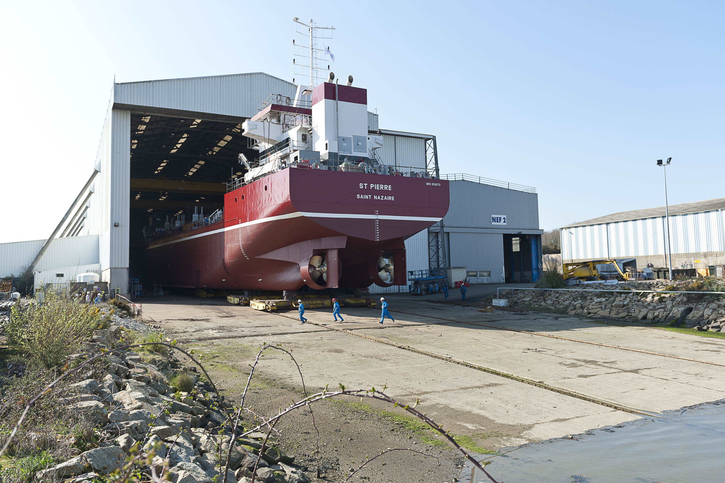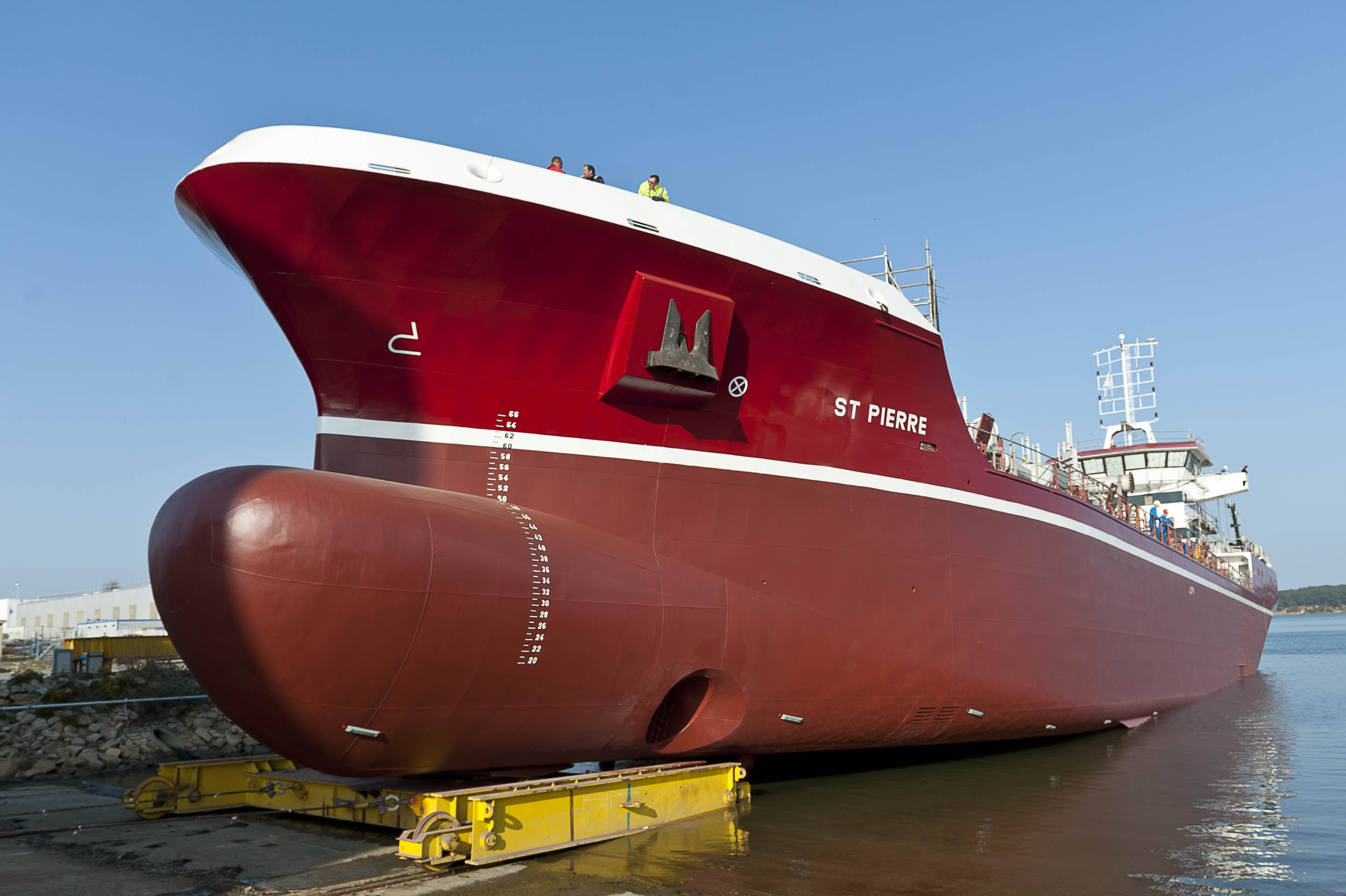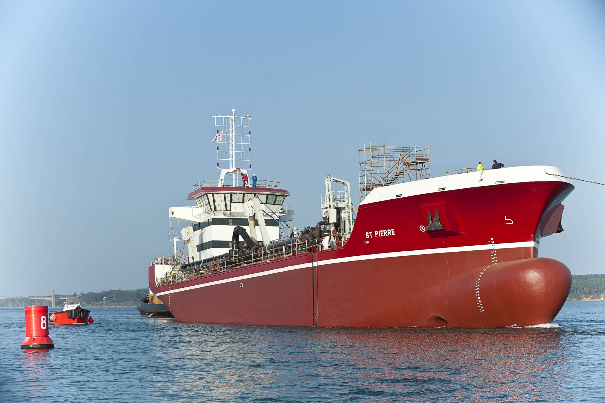 Mise à l’eau du sablier le Saint-Pierre au chantier STX de Lanester. Commandé par la Société de Transports Fluvio-Maritimes de l’Ouest, ce navire sablier à élinde traînante, d’une longueur de 84.10 mètres, pour une largeur de 15.6 mètres. Avec une vitesse de service de 13 nœuds et une capacité de 2000 m3, il pourra extraire des granulats jusqu’à une profondeur de 45 mètres. Le navire, qui bat pavillon français, sera exploité toute l’année sur la façade Atlantique.